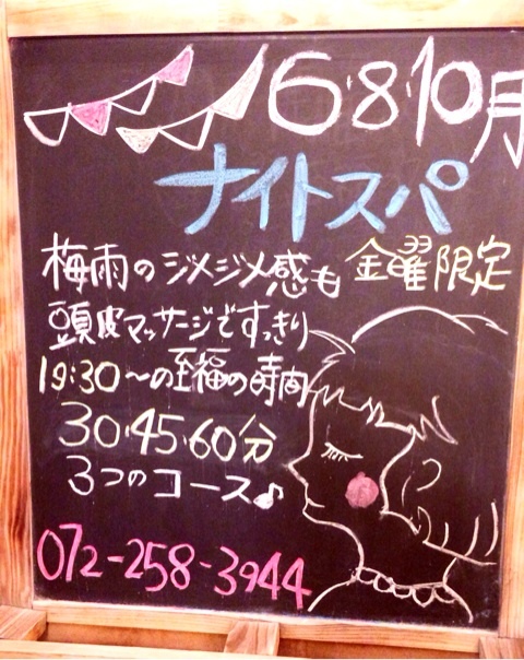 BLOG ブログ ホーム > 未分類 > 今日はラストナイト☆ 2015/08/28 いよいよ 明日は今月ラストフライデイ ということは、 偶数月ということで ナイトスパ今月のラスト日 ですっ!!! まだ体感したことない方 夏の疲れを癒されに おこしくださいっ ご予約空きございます! お電話おまちしてます あと、 八月夏休みイベント キッズカットも 明日でおわりですっ 学校始まるまでに かっこよくかわいく なりたいお子さん集まれっ 小学生までのお子さん なら誰でもです 1080円でキメキメに なれるチャンスです!! お電話でのご予約 お願い致します。 - 未分類